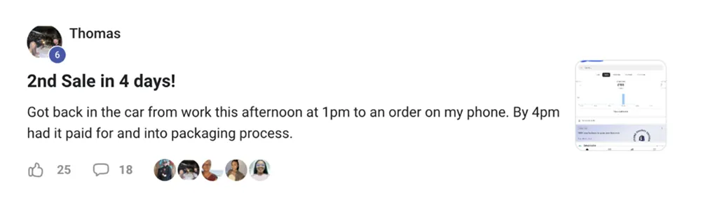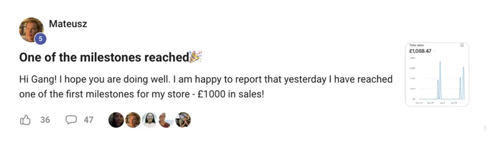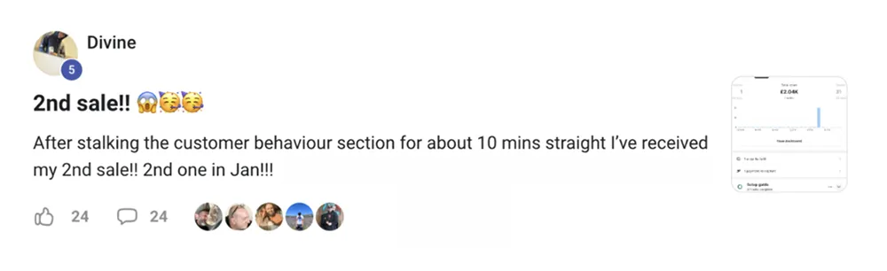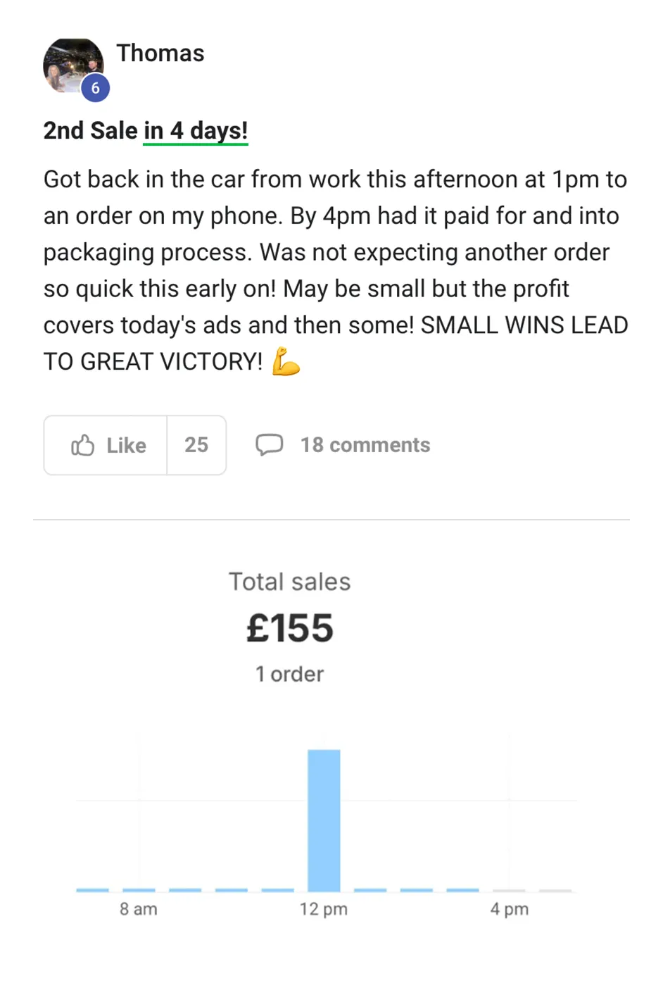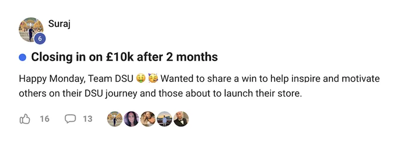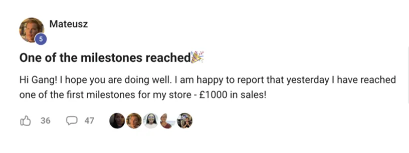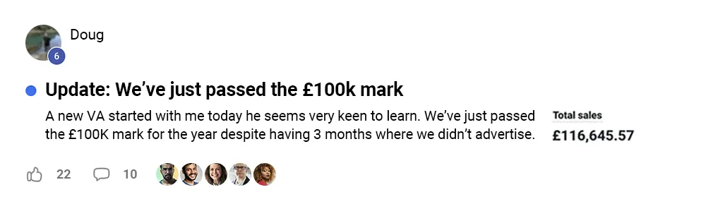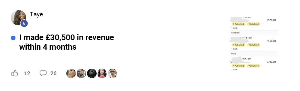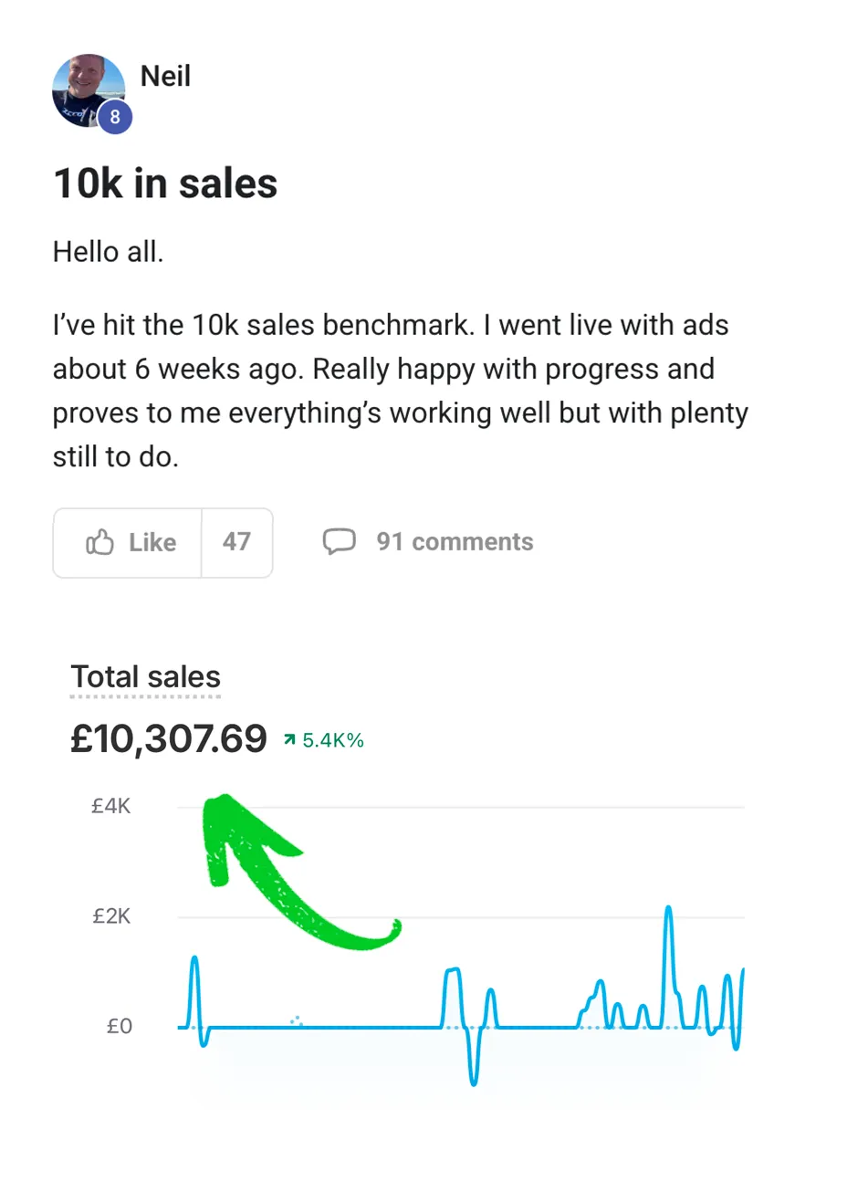 As well as that, you’ll be part of a thriving community of other UK e-commerce entrepreneurs - all building their businesses together, sharing wins, and helping each other stay accountable.