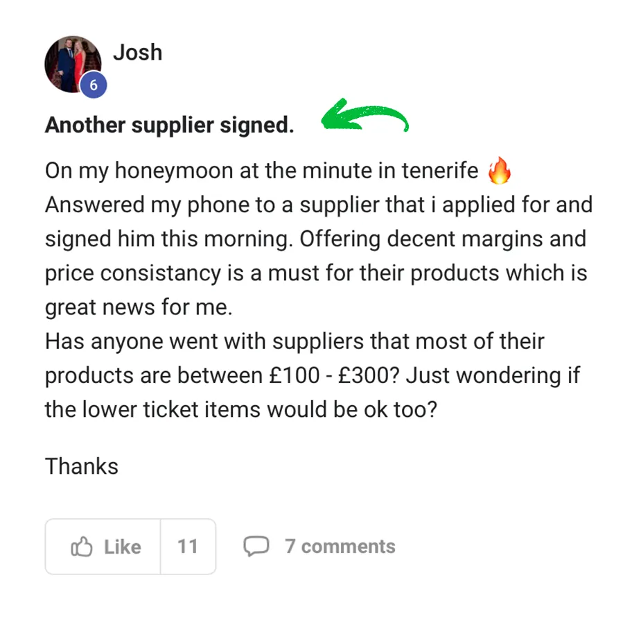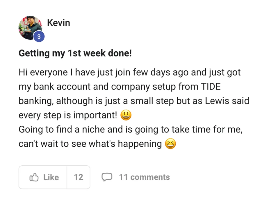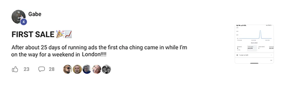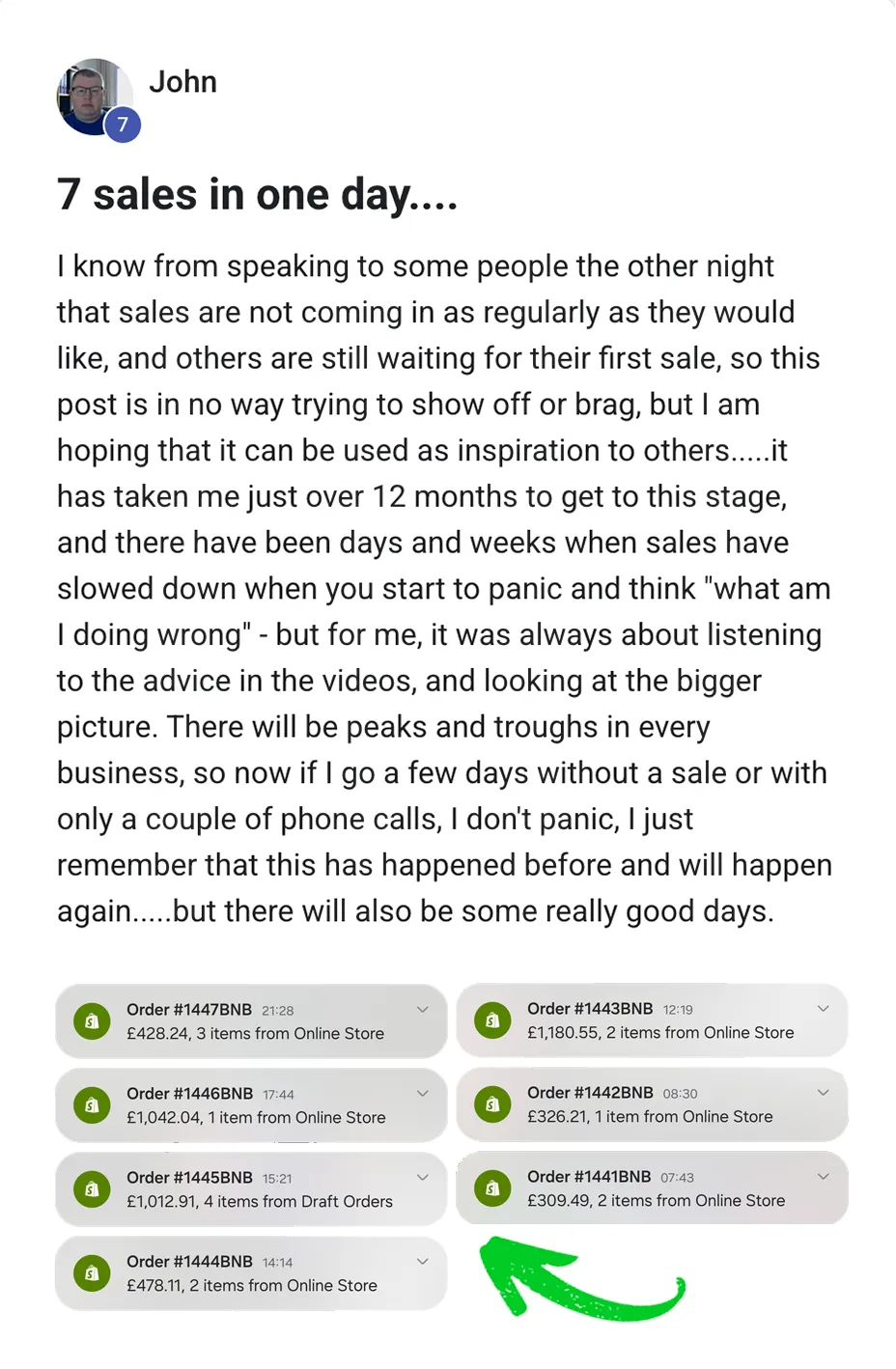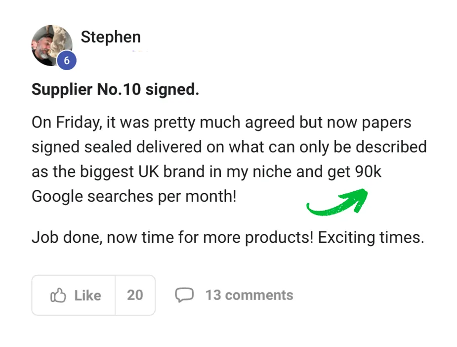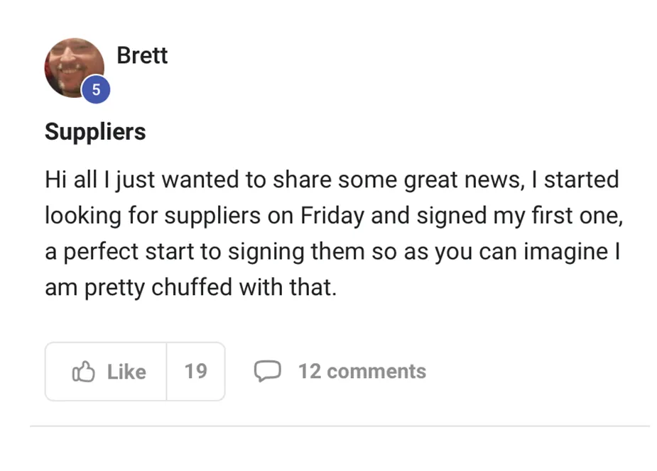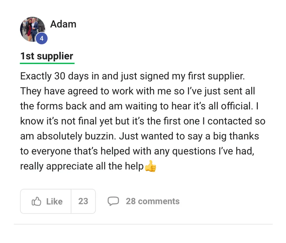 As well as that, you’ll be part of a thriving community of other UK e-commerce entrepreneurs - all building their businesses together, sharing wins, and helping each other stay accountable.